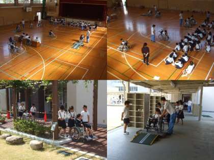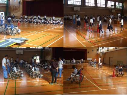 大阪市立心身障がい者リハビリテーションセンターの方々に来ていただき、車いす体験をしました。 説明を聞いたのち、体育館に設置されたコースで、車いすに乗っての自走体験をしました。跳び箱で狭くなった道を通るのが難しかったようでした。