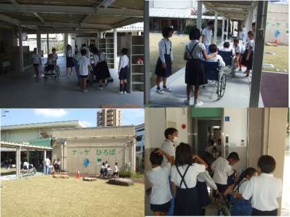 次に、グループごとに分かれて介助体験をしました。体育館から外に出て、ナッケ広場からピロティを通って北校舎のエレベーターに乗るコースを往復しました。
