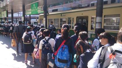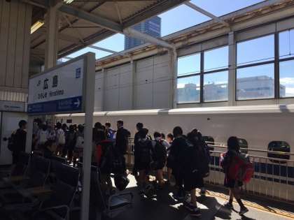 広島駅に到着しました。同じような修学旅行生がいっぱいです。これから広電に乗ります。