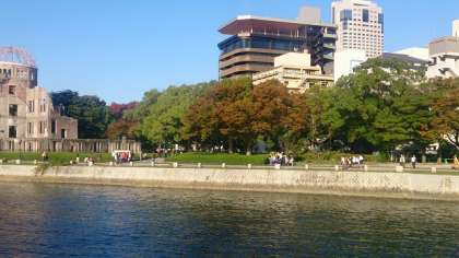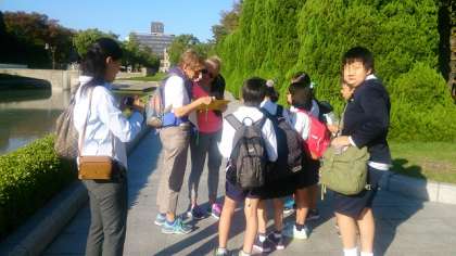 碑めぐりをしながら、外国から来ている人にインタビューしてピースメッセージを集めています。