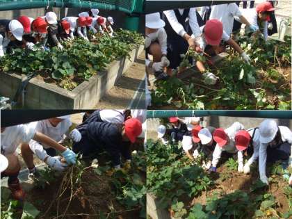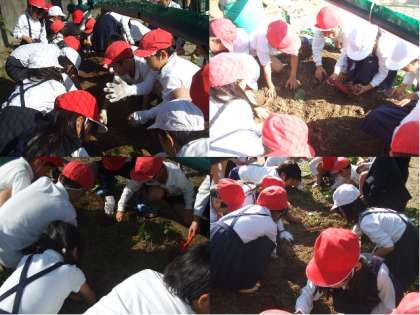 5月に苗を植えたサツマイモを収穫しました。掘り出すまではどんなサツマイモが出てくるか不安でしたが、掘り始めると「でてきた!」「やったー!」とあちこちで声があがりました。どんな味がするか楽しみですね。