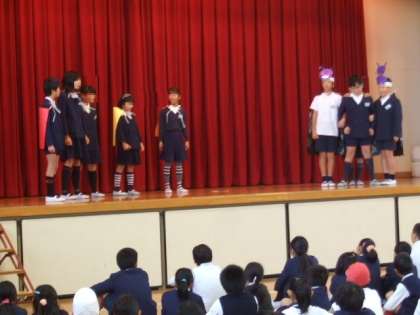 11月30日(水)の児童朝会は、健康委員会の発表でした。これから流行することが考えられる「かぜやインフルエンザ」の予防のために、「手洗いやうがい」をしっかりやりましょうという内容の劇をしました。その後、「手洗いの歌」に合わせて手洗いの仕方を練習しました。