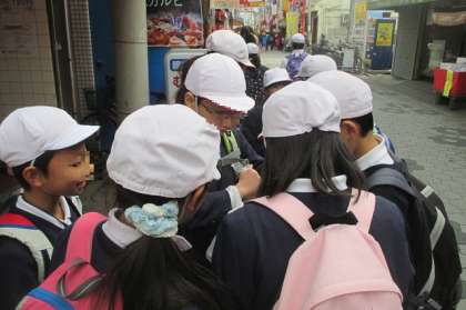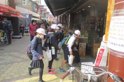 5年生がコリアタウンへ社会見学にいきました。2学期に、本校の「日本語教室」に来ている子どもたちと交流したり、国際理解教育の時間に「ようこそコリアタウンへ」の学習をしたりしました。どのグループも興味深くお店を見て回り、ルールを守って買い物をしていました。買い物をしながらお店の人と会話がはずんでいるグループもありました。コリアタウンの人々の様子や文化にふれることができたのではないかと思います。