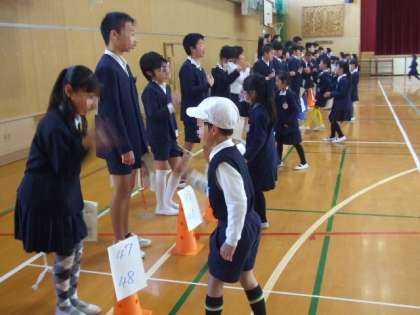 今日の集会は、「じゃんけんリレー」でした。スタートラインから走って行って、リーダーとじゃんけんをして勝ったら次の人とタッチします。負けたらもう1度やり直すので、何回も負けると大変です。でもみんな頑張っている友だちを大声で応援をしていました。みんな力を合わせて楽しく取り組んでいいました。