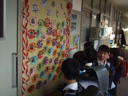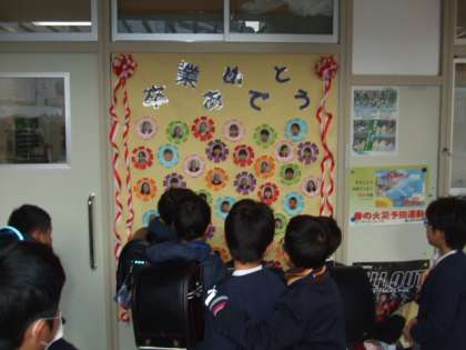 毎年、3月の職員室前の掲示は、「卒業おめでとう」の掲示になります。今日、張り出された掲示物を見た子どもたちは、さっそく自分のふれあい班のリーダーを探していました。「うちの班のリーダーや!」「ぼくの班のリーダーはどこかな?」と職員室前でワイワイ言っていました。
