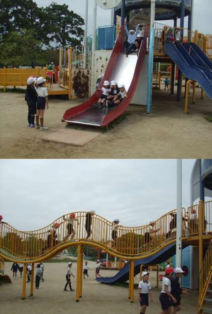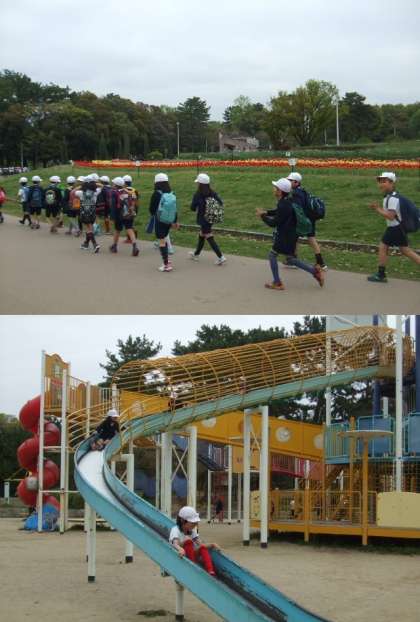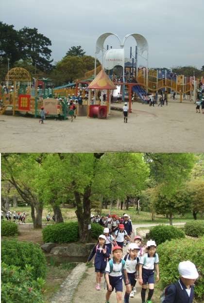 3・4年生は21日(金)に服部緑地へ春の遠足に行きました。少して天気が心配でしたが、予定通り出発できました。他の学校よりも早く到着したので、午前中の活動場所は人が少なくて、待たずに遊具を使用できました。思い切り活動できたのではないかと思います。