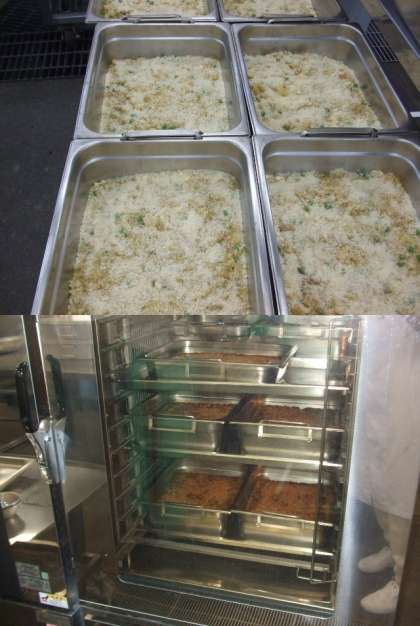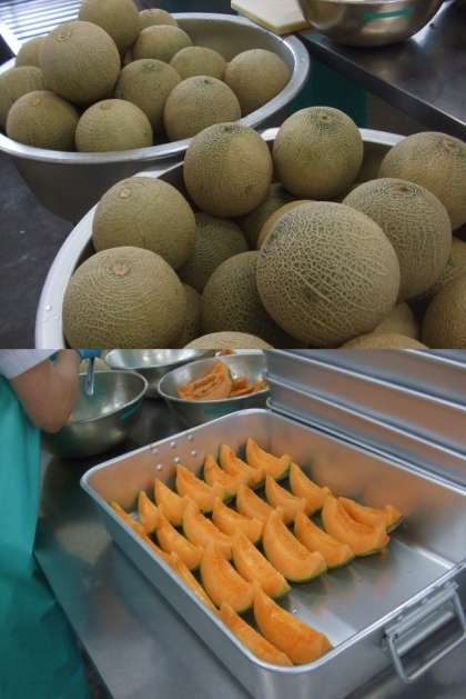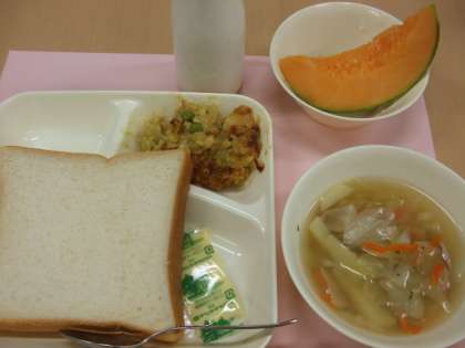 給食の献立は「カレードリア、キャベツのスープ、クインシーメロン、食パン、マーガリン、牛乳」でした。「カレードリア」は、鶏肉、たまねぎ、グリンピースの入ったカレードリアです。釜で作った具をクラスごとにミニバットに入れ、チーズとパン粉をふり、焼き物機で焼きました。こんがりおいしく焼けました。「キャベツのスープ」は、豚肉を主材にキャベツ、じゃがいも、にんじん、パセリの入った野菜の甘みのあるスープです。これに年1回の「クインシーメロン」がつきました。1個を1/8に切り、種を丁寧にとりました。オレンジ色で皮に網目模様があるクインシーメロンは、ちょうどよく熟していて甘みがありました。
