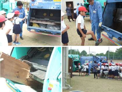 次にパッカー車を2台乗ってきていただいたので、実際にゴミ投入の体験することができました。一人一人ボタンを押して機械を動かしたり止めたりしました。最後に大きな家具をパッカー車に入れるところを見せてもらいました。バリバリと大きな音をだしてこわれていくときに、その凄さにみんな驚いた様子でした。普段では体験できないことを学習することができました。