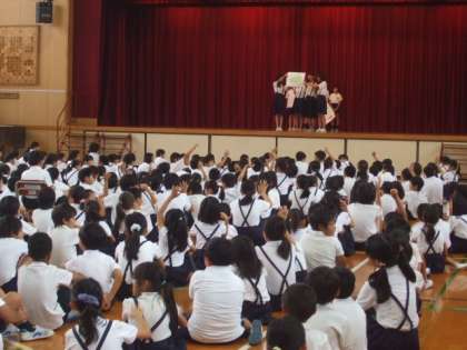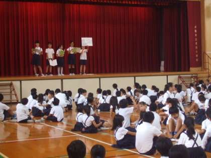 今回の児童集会は、給食委員会の発表と集会委員会のクイズでした。給食委員会は、7月の給食にでてくる夏野菜「とうがん」と「ピーマン」についての説明とクイズがありました。