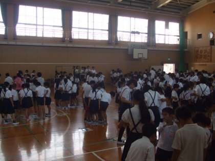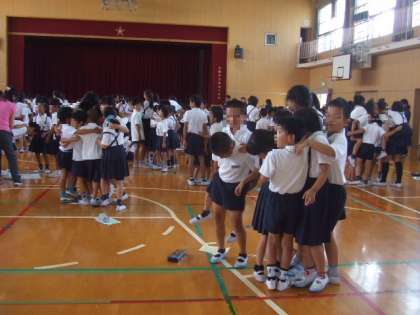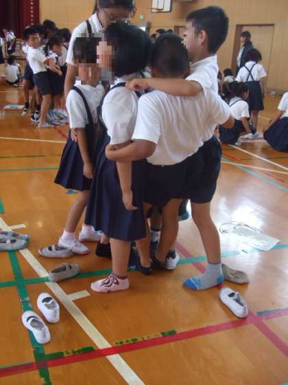 班の代表と集会委員がジャンケンして、班の代表が負けると新聞が半分になっていきます。新聞が小さくなると、高学年が低学年の友だちをおんぶしたり、上靴をぬいで足の面積をできるだけ狭くしたりしていました。