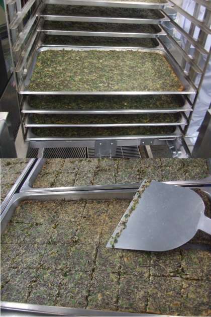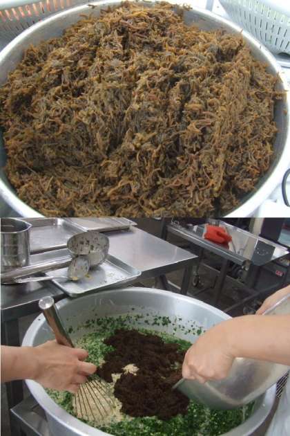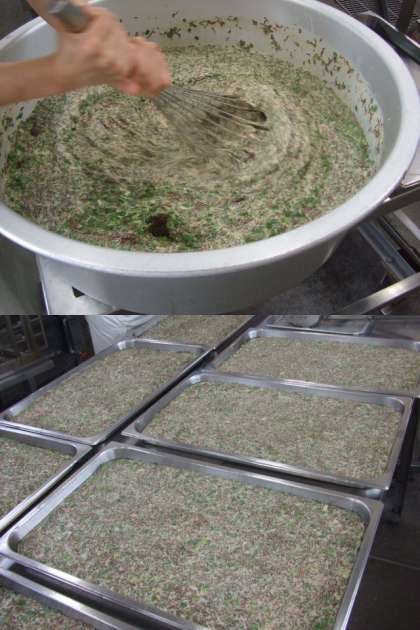 今回、沖縄でとれたもずくや、にらを調味料で味をつけた生地に混ぜて焼き物機で焼きました。焼きあがった生地にみりん、酢、こいくちしょうゆ、水でたれを作りかけました。