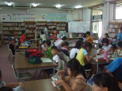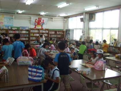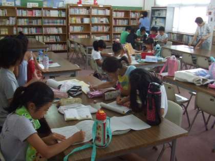 図書館ボランティアの方々のご協力で、夏休みに図書館開放をしていただいています。読書をしたり、本を借りたり、学習したりと、子どもたちは有意義に活動しています。