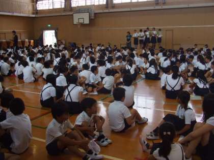 2学期最初の児童集会がありました。今日は、まず「3ヒントゲーム」をしました。3つのヒントから答えを班で相談して予想します。どの班も楽しく協力して活動していました。