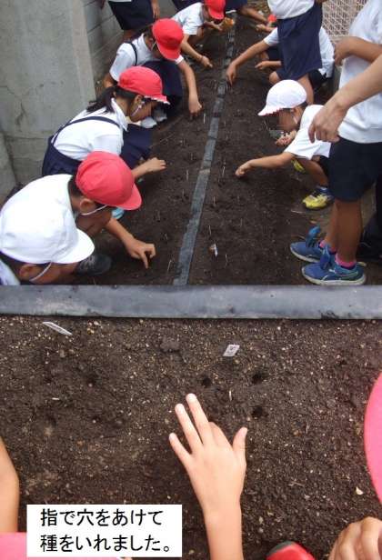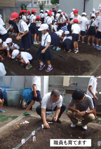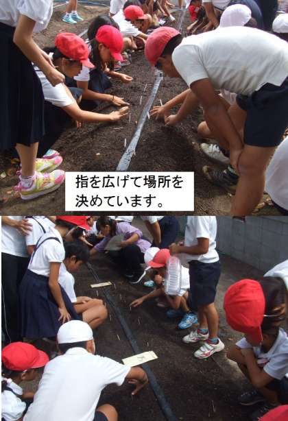 今年度も、なにわの伝統野菜「田辺大根」の栽培活動が始まりました。全校児童が一人1本ずつ「田辺大根」の種を植えました。田辺大根サポーターの方に教えていただいた6年のリーダーが、班のみんなにていねいに教えていました。みんな種と種との間隔を、自分の指を広げてはかって目印をたてました。そして、その目印を中心に5粒ずつ種をうえました。