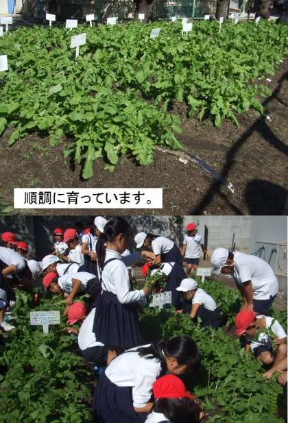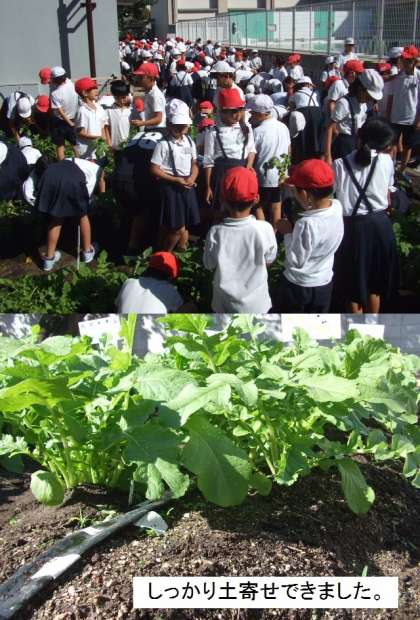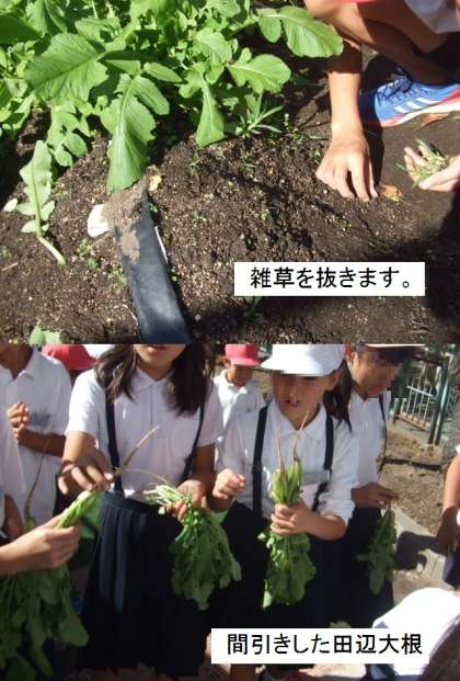 今日は、大きくなってきた田辺大根をもっと大きく育てるために、3本から2本に間引きしました。思っていたよりも根の部分が長くなっていてビックリしていました。そして、雑草取りや虫とりをして、まっすぐに育つように土寄せをしました。