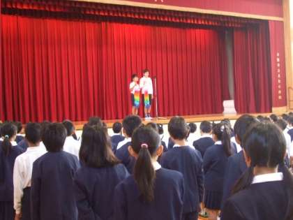 今日の児童朝会で、「ふれあい班で折ってくれたおかげで千羽鶴が完成しました。ありがとうございました。」と、6年生からお礼の言葉がありました。みんなで作ったこの鶴を持って、明日火曜日から修学旅行に行きます。