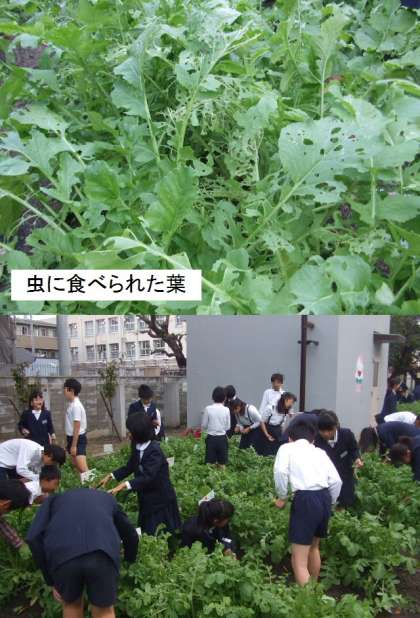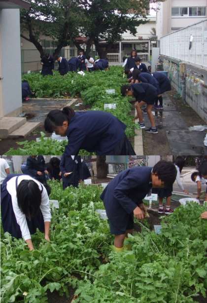 また、1週間ほど田辺大根の世話ができていなかったので、朝会後農園に出て、虫とりや雑草抜きをしました。「虫が葉を食べて穴だらけや。」と驚いた様子でしたが、頑張って世話をしていました。