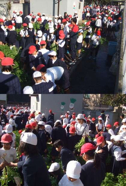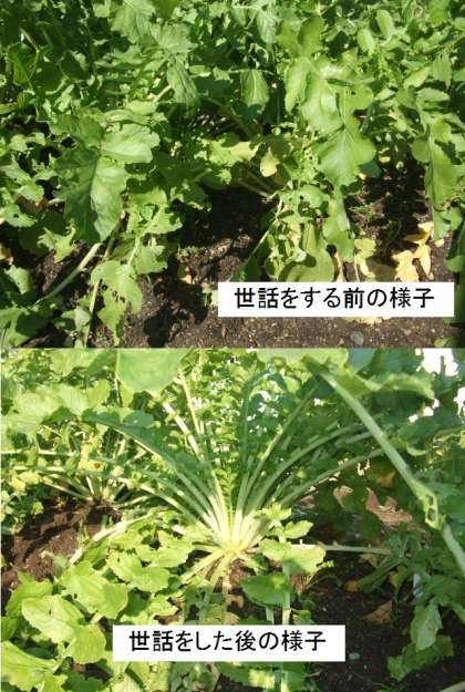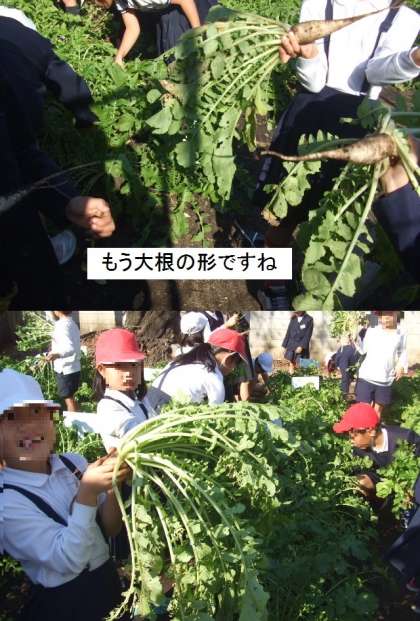 いよいよ今日は間引きをして最後の1本にしました。思っていたよりも根の部分が大きくなっていてビックリしていた人もいました。葉が虫に食べられている大根があるので、虫とりをがんばりました。そして、まっすぐに育つように土寄せをしました。