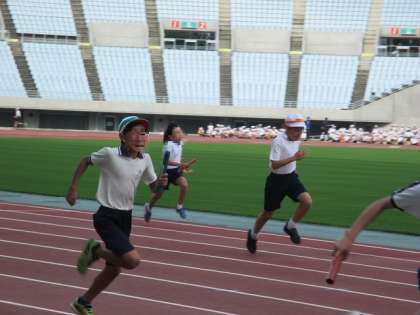国際大会も行われるトラックで、100m走・4×100mリレー・800mジョギングをしました。