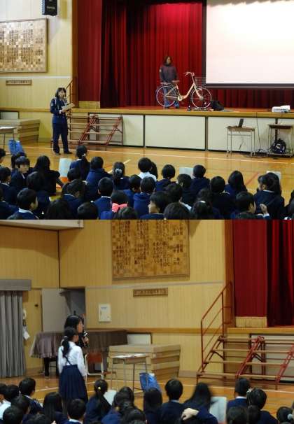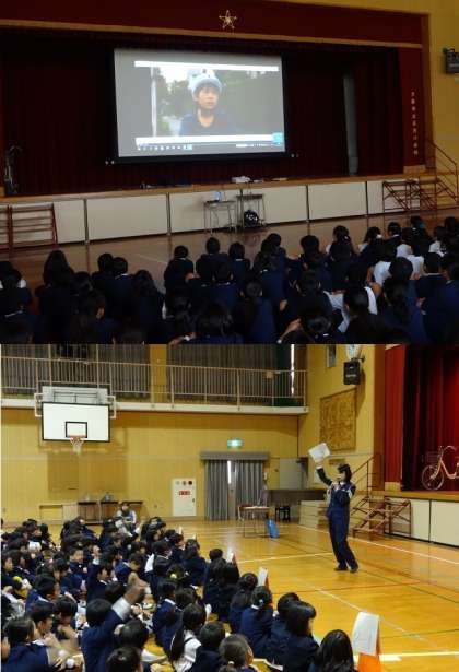 低学年は、交通ルールについてクイズ形式で学習しました。高学年は、自転車の正しい安全な乗り方のDVDを見ながら学習しました。