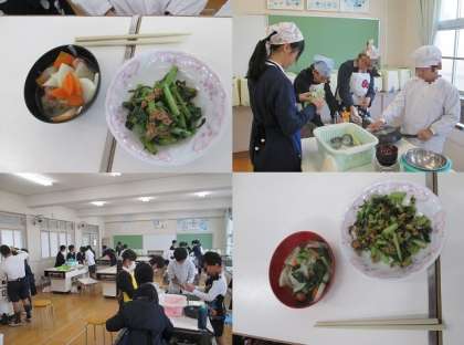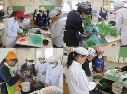 田辺大根を使って6年生が調理実習をしました。全校児童で世話をする「ふれあい農園」とは別に、6年生は南側のフェンス沿いに畑を作って、調理実習用の田辺大根を育ててきました。朝の日光がよくあたるので、思った以上に大きな田辺大根が収穫できました。