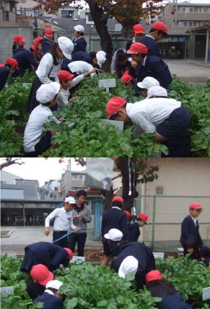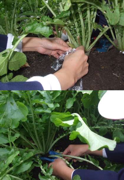 今日は、当日に抜くマイ大根に、目印としてスズランテープを巻きました。スズランテープを巻いていない田辺大根でお味噌汁を作っていただきます。