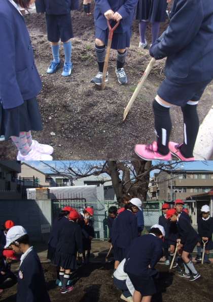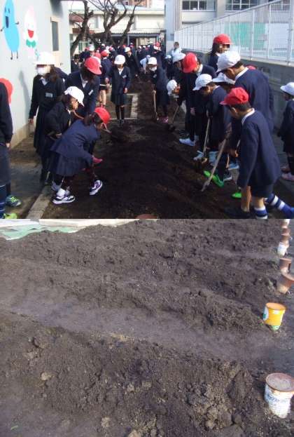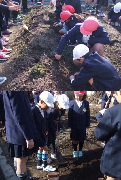 高学年が低学年に掘りおこし方をやさしく教えていました。来年度も、たくさん収穫ができるように、みんなで力を合わせてがんばりました。