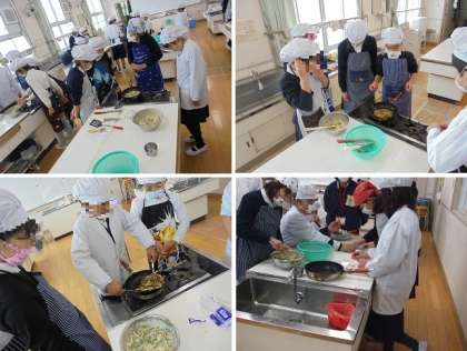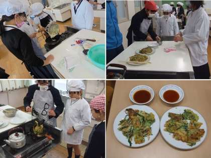 今回は、家庭科室で自分たちがチヂミ作りに挑戦しました。みんなで協力して野菜を切って粉と混ぜました。焼いたチヂミは、ピリ辛味とポン酢の2種類のタレで味わいました。初めて自分たちで作ったので格別においしかったみたいで、みんな大満足でした。