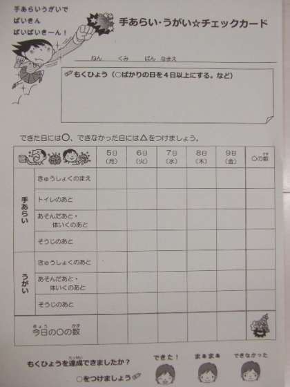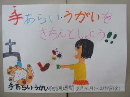 2月5日(月)〜9日(金)は「手洗い・うがい強調週間」です。クラスで健康委員会の児童が描いたバイキンの絵に、手洗い・うがいをする毎にシールを貼って、みんなで退治していきます。放送朝会でも健康委員会の人が呼びかけをしていました。