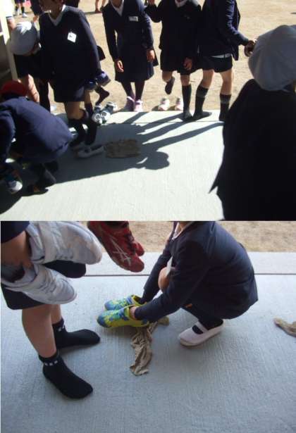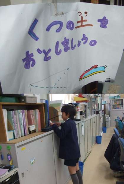 そこで、環境委員会が履き替える時に、「下靴の底の土をしっかりおとしましょう。」と放送でよびかけをしています。また、濡れた雑巾を用意して、それで下靴を拭くことができるようにしてくれています。