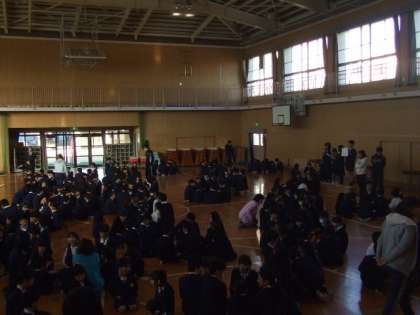 今日は、「しりとり」ゲームでした。スタートの文字を集会委員会から発表されます。ふれあい班で2周したらしゃがむことができます。
