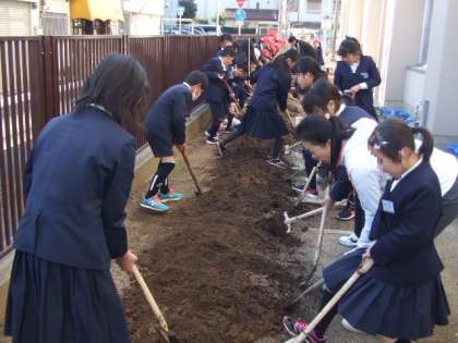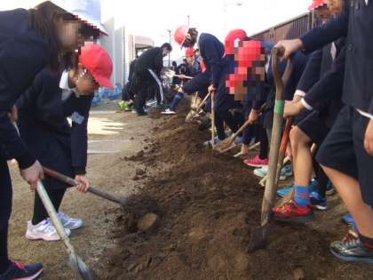3年前から少しずつ腐葉土や堆肥を混ぜて、土づくりをしてきたので、田辺大根も育つようになってきました。今日は5年生がその新しい農園を耕しました。