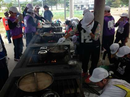 火をおこし、具材を刻んでグツグツ。飯盒は水加減と火加減に注意して。さぁできた!