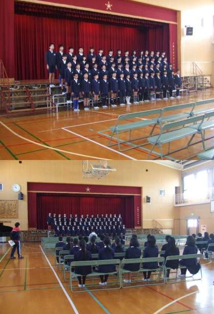 「別れの言葉」では、大きな声で「よびかけ」をしています。そして、澄んだ歌声が体育館に響いています。