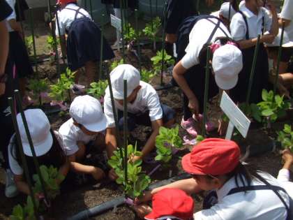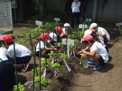 エダマメがグングン大きく育ってきています。ふれあいタイムの時間にエダマメが折れたり、倒れたりしないように、支柱をたててスズランテープで結びました。結ぶのが難しい低学年の児童には、高学年の児童が一緒に結んでいました。教室での活動と交代で行いました。教室では、ナッケカーニバルのお店を相談して第3希望まで決めました。ナッケカーニバルにむけての活動も本格的に始まりました。