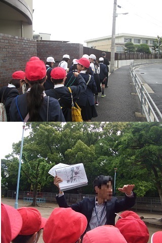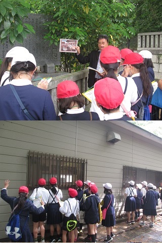 実際に歩いてその場所へ行ってお話をしていただきます。古い資料や写真を準備してくわしく教えてくださいました。