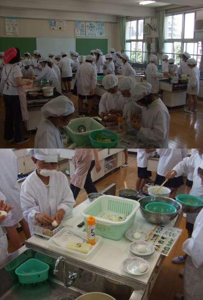 5年生は、調理実習をすることが初めてなので、とても楽しみにしていました。みんなで協力して野菜を切ったり、時間をはかりながらゆでたまごを作ったりしました。そして、自分たちでドレッシングを作っておいしく食べることができました。