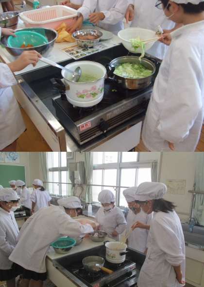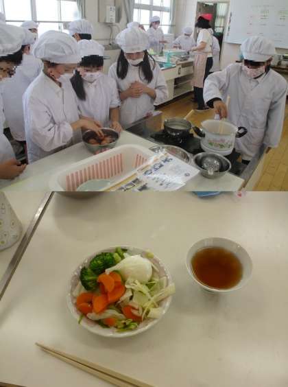 5年生が調理実習をしました。「カラフルゆで野菜」(ニンジン・ブロッコリー・キャベツ)・ゆでたまごのサラダでした。
