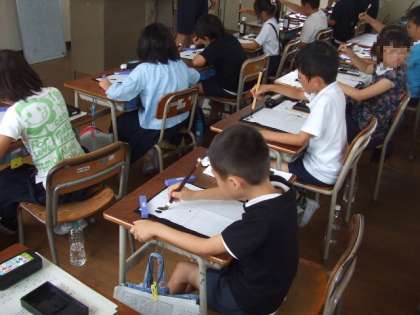 生まれて初めて筆を使い、文字を書く子がほとんどです。今日は道具の準備のやり方、墨汁の出し方、筆の持ち方など細かいところを少しずつ進めていきました。