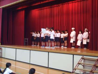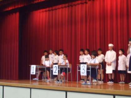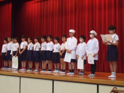いろいろと工夫したクイズを通して、給食について理解を深められた発表でした。最後に、新しい「おさつパン」についてのアンケートの結果発表がありました。