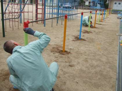 以前からホームページでお知らせしていますが、管理作業員が、学校のいろいろな場所をきれいにしてくれています。 今回は運動場北側の鉄棒を、新品のようにきれいにペンキで塗ってくれました。