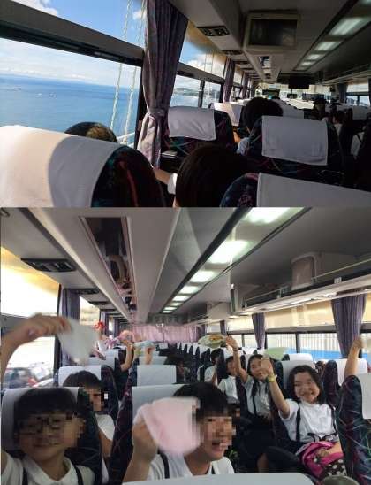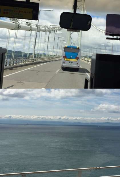 明石海峡大橋を渡っています。バスの中。クイズをしたり、のりのりで音楽を聴いたりしています。明石海峡大橋を渡るときは上からの眺めに大喜び!天気もよく、よい眺めです。