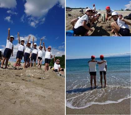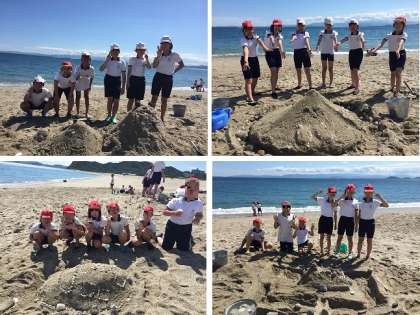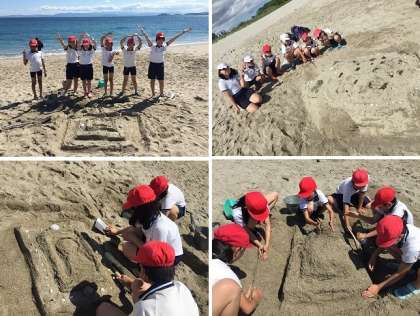 砂の造形ができました。みんな協力して楽しい作品ができあがりました。ポーズも決まっていますね。