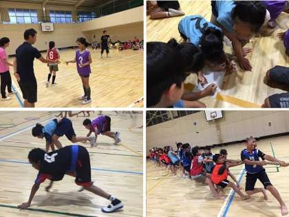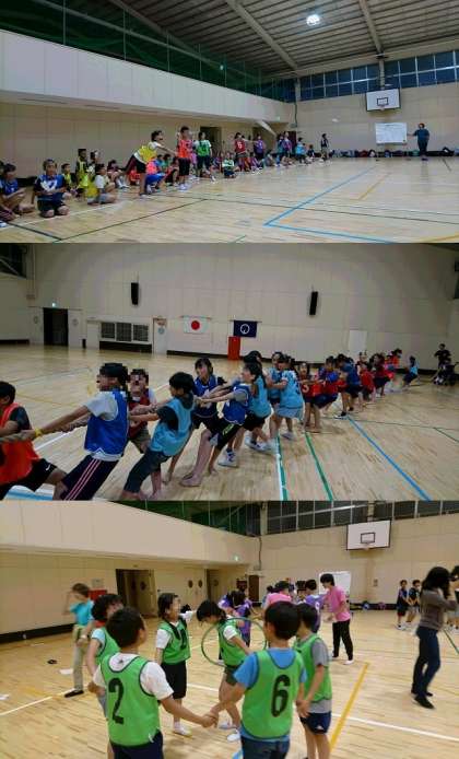 室内オリンピックで楽しんでいます。紙飛行機対決・綱引き・輪くぐりリレーなど班対抗で盛り上がりました!