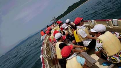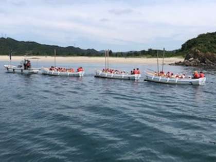 指揮艇にリードされて沖まで出ます。櫂を立てて、今から自分たちの力で進みます
