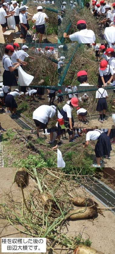 そのような時期になると、晴れの日を待って6年生が2学期の「ふれあいタイム」で育てる「田辺大根」の種を収穫します。昨年の6年生が、昨年の9月に植えてくれたものです。毎年6年生が、次の年度のために種取り用の畑で育ててきました。もう15年以上も続いている長池小学校の伝統です。