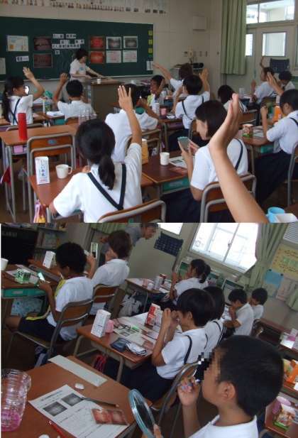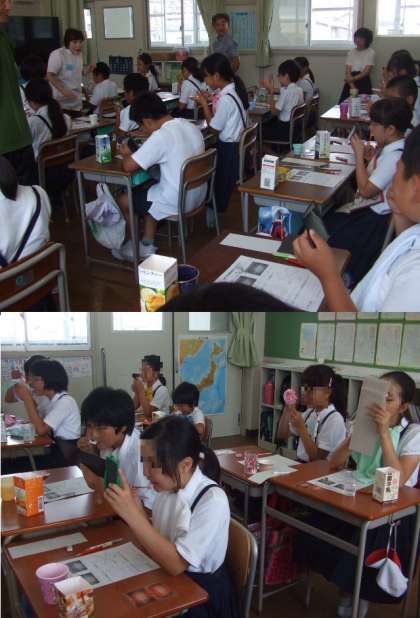 次に、自分たちの歯がどうなっているかプラークチェッカー(歯垢染色液)を使って前歯を染色しました。そうすると色のついた部分があり、みがきおとしが多いことに気づきました。そこで、上手な歯みがきの仕方について教えていただきました。