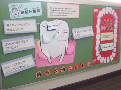 全児童のむし歯の場所にシールをはって、どこが磨けていないかを目で見てわかるようにしました。おく歯にむし歯が多いですね!