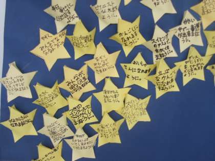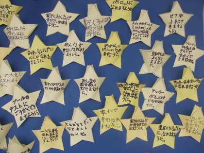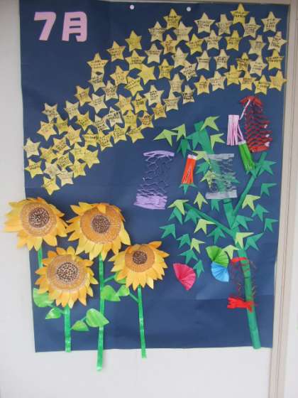 7月になって職員室前の掲示物がかわりました。3年生が作った夏をイメージした掲示です。星には、みんなの願い事が書かれています。