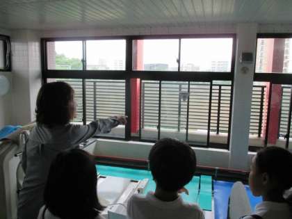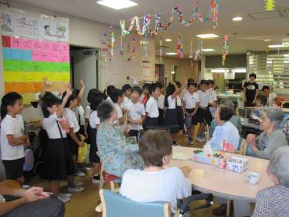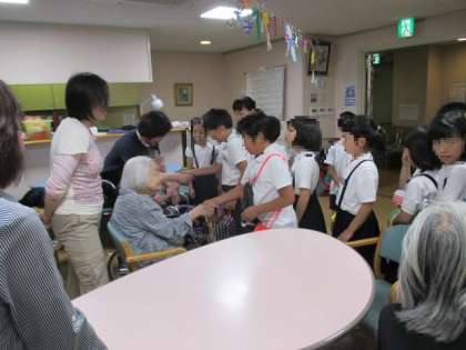 4年生は、地域にある高齢者デイサービスセンター「いくとく」と、毎年交流をさせていただいています。今日は、施設の見学をさせていただきました。館内をいろいろと案内していただいた後、利用されている方々とふれあう機会もつくっていただきました。